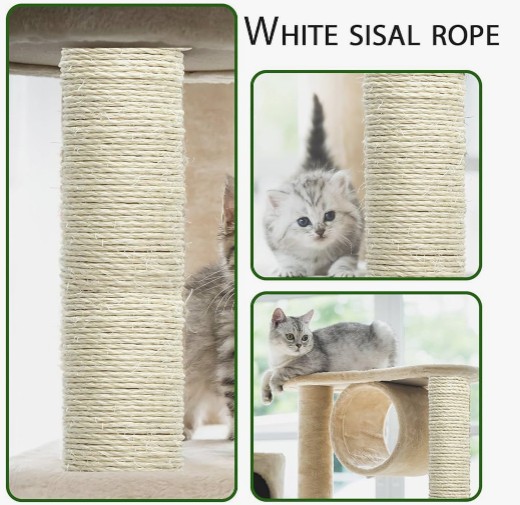 5. Talous ja käytännöllisyys: Luonnollisena kuitumateriaalina sisal -navat ovat suhteellisen alhaiset kustannukset ja helppo käsitellä ja asentaa. Sisal-napojen käyttäminen puutornissa condo-kissan puiden kiipeilykehyksessä voi vähentää tuotantokustannuksia, parantaa tuotteen käytännöllisyyttä ja kustannustehokkuutta ja vastata lemmikkieläinten omistajien tarpeisiin ja odotuksiin.