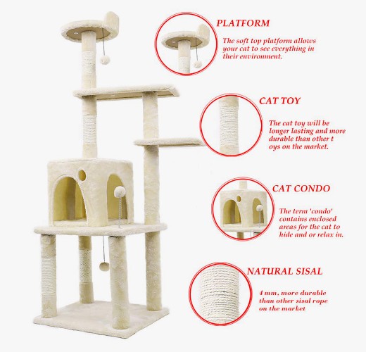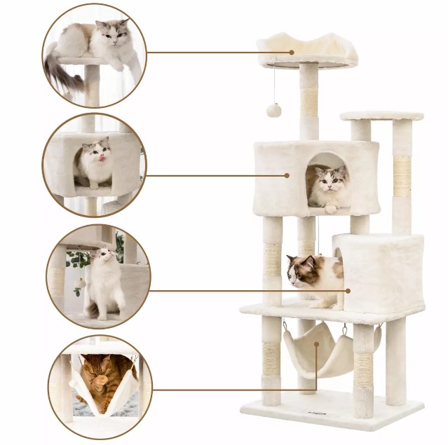 3. Rikastuvien kissojen elämäkokemus: Kissapuut on yleensä varustettu monilla leluilla ja interaktiivisilla laitteilla, kuten roikkuupalloilla ja heiluttavilla köysillä, jotka voivat stimuloida kissojen metsästysvaistoja ja antaa heille hauskaa ja tyytyväisyyttä pelissä. Pelaamalla kissat voivat kuluttaa energiaa ja parantaa vuorovaikutusta ja emotionaalista yhteyttä omistajiensa kanssa.