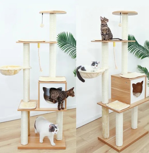| Kestävyys ja vakaus | Ympäristöystävällisellä puulla on luonnollinen voima ja sitkeys, se kestää kissoja kiipeilyä ja hyppäämistä, sillä on hyvä korroosionkestävyys ja hyönteisten vastus ja pidentää kissan puun käyttöikä |